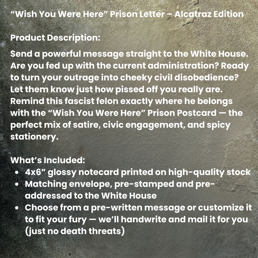Let them know just how pissed off you really are. Remind this fascist felon exactly where he belongs with the “Wish You Were Here” Prison Postcard — the perfect mix of satire, civic engagement, and spicy stationery.