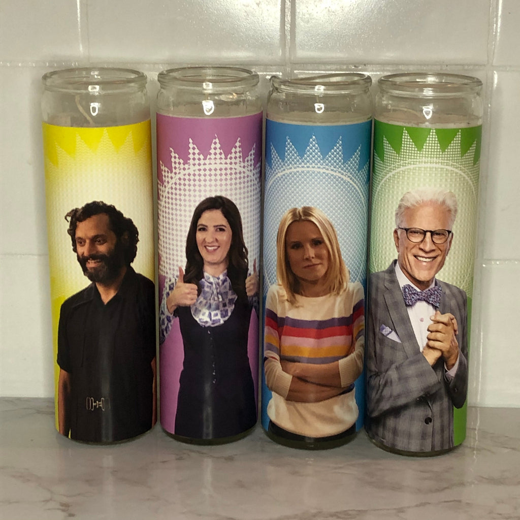 Four of your favorite The Good Place characters Saint Candles. Michael, Eleanor Shellstrop, Janet, Derek